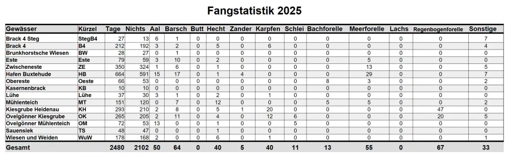 Fangstatistik 2025 Fangstatistik 2025 Die Mitglieder waren 2480 mal Angeln und haben 2102 mal nichts gefangen. Es wurden insgesamt 378 Fische gefangen.