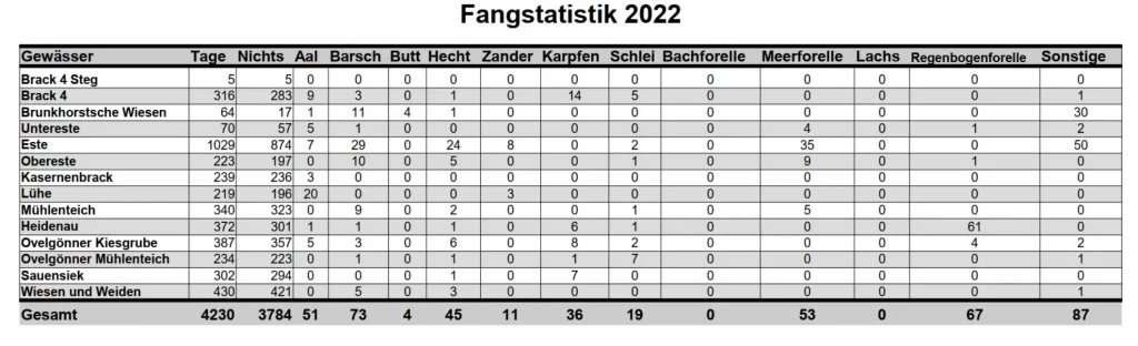 Fangstatistik 2022 Fangstatistik 2022 Die Mitglieder waren 4230 mal Angeln und haben 3784 mal nichts gefangen. Es wurden insgesamt 446 Fische gefangen.