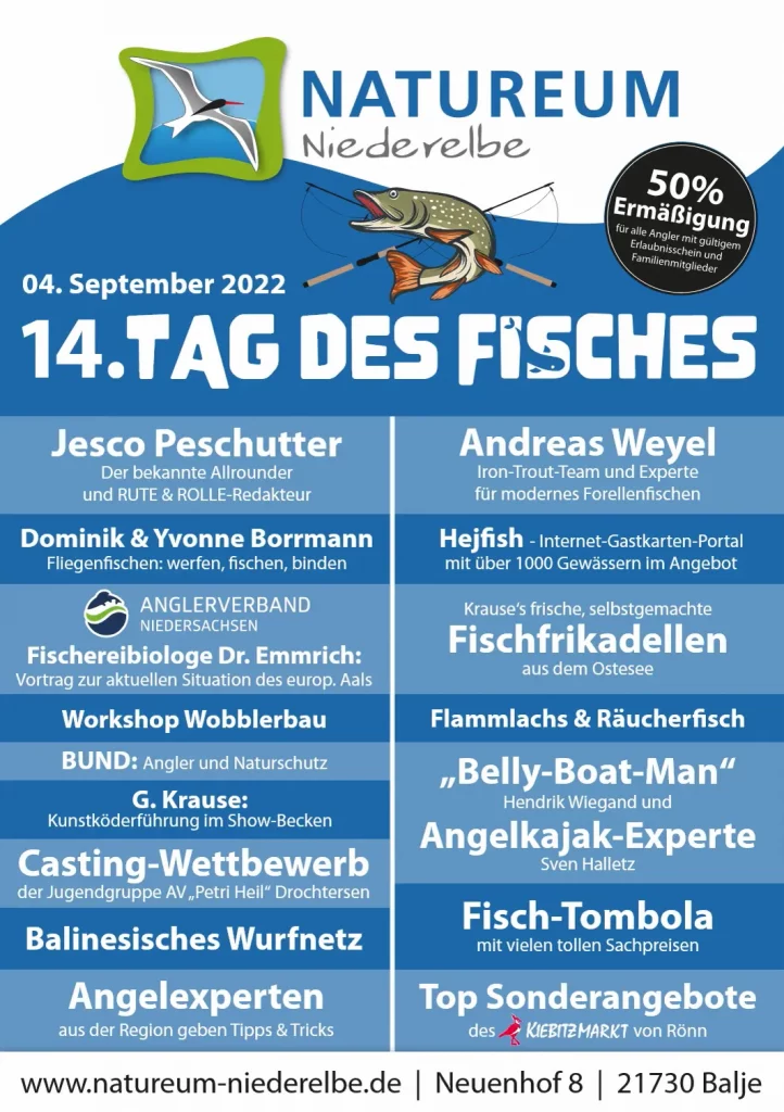 Am 07.09.2025 von 10:00 – 17:00 Uhr findet der 17. Tag des Fisches im Natureum Niederelbe statt. Im Rahmen der Veranstaltung wird es auch wieder einen Anglerflohmarkt geben.